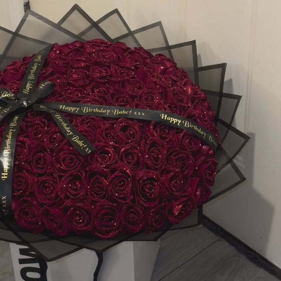 Make a lasting impression with our Signature Ribbon Glitter Roses Bouquet – a luxurious arrangement of hand crafted, artificial velvet roses, beautifully encased in our signature layered wrapping and tied with a premium satin ribbon.